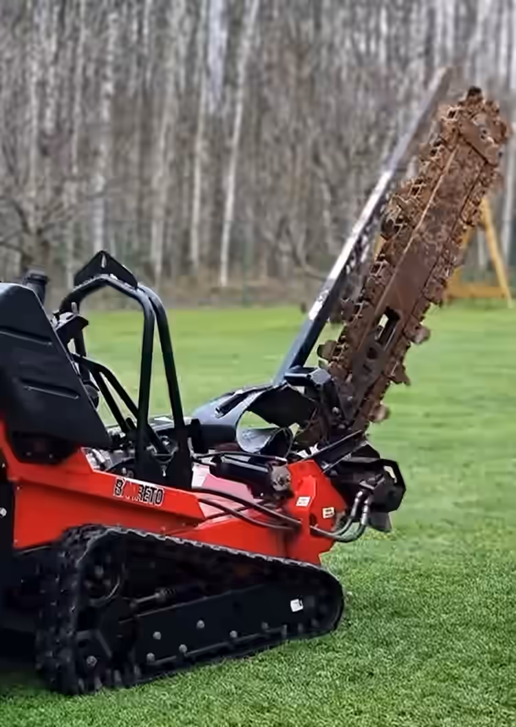 Dirbame su mini ekskavatoriumi, sodžių pjaustytuviu ir specializuotais įrankiais – tai pagreitina darbą ir sumažina pažeidimus vejai.